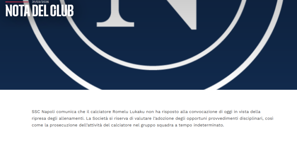 Sulla pagina ufficiale del club è quindi stato pubblicato un comunicato freddo quanto duro: “SSC Napoli comunica che il calciatore Romelu Lukaku non ha risposto alla convocazione di oggi in vista della ripresa degli allenamenti. La Società di riserva di valutare l’adozione degli opportuni provvedimenti disciplinari, così come la prosecuzione dell’attività del calciatore nel gruppo squadra a tempo indeterminato”.